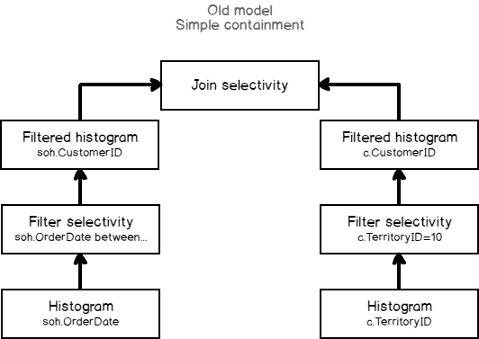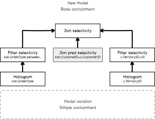 That means, that two tables are first filtered by TerrioryID and OrderDate, then the filter statistics collection is used by the join to estimate the join condition selectivity. We may depict this process using the following scheme: