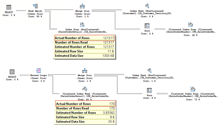 Let’s add another table to view the actual differences in the query plans. Suppose we want to know the order detail information also, and join SalesOrderDatail table for that purpose.