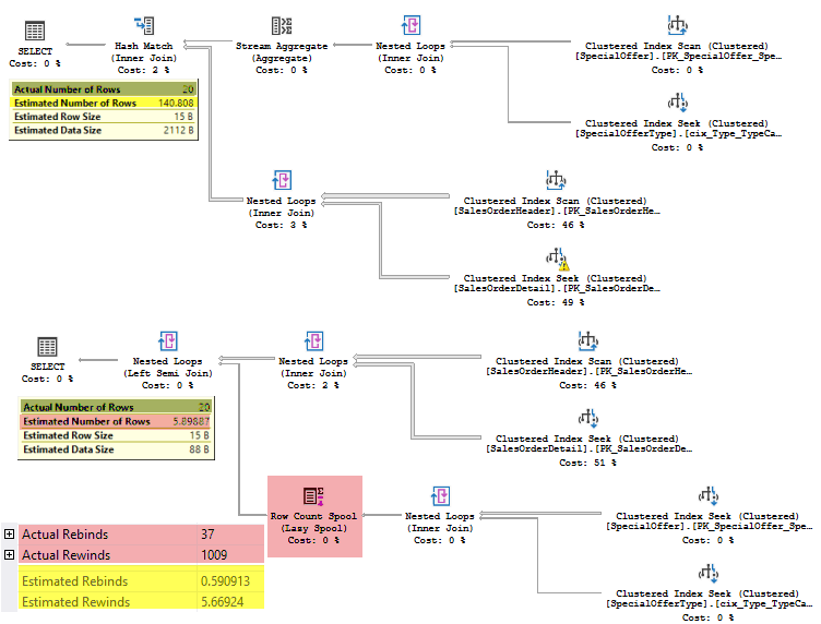 It may be a point of doubt which plan is more efficient, because the first one (using the old CE) is still overestimating the Join, but the second one, this time, underestimated the Join row count. The estimated number of rows is 6 while the actual is 20. The numbers are small as the database is small, but even here, the second plan uses the Spool to optimize rewinds (and I particularly don’t like the plans with a spool and underestimated rewinds – 5 estimated vs. 1000 actual).