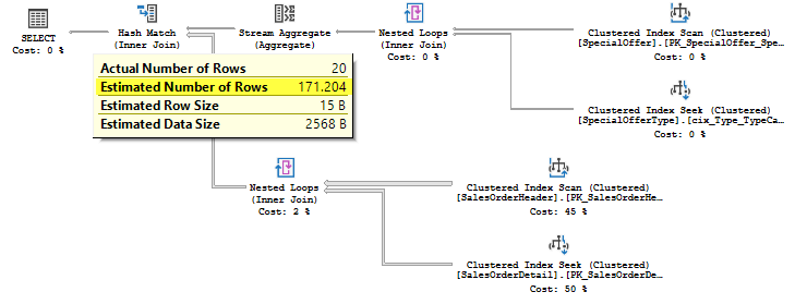 We see that the first query overestimated the number of rows more than 10 times! The other two are pretty close to the actual number of rows. There is a small difference between them, that is because some algorithm details have changed, however, they both use the same approach contradictory to the old model without any extensions. Of course, this query is too simple to result in different plans due to the different estimates, we’ll look at the more complex example later in this post. Now it is interesting to know – why does the first query overestimated the Join 10 times.