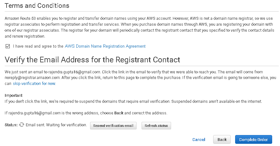 It is not convenient for users to remember the endpoint name. You might not get a good response for your website even it has relevant content. For this purpose, we can use the existing domain name or purchase a custom domain name. I do not have any domain names so let’s buy it from Amazon.