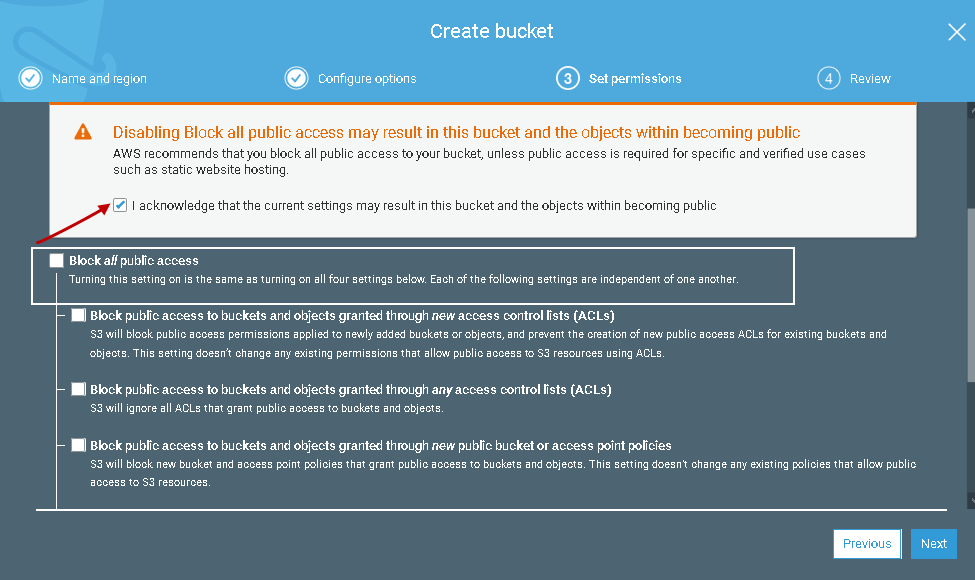 AWS does not allow public access for s3 bucket, by default. We need to edit this behavior for a static website. Click Next, and you see default behavior – Block all public access.