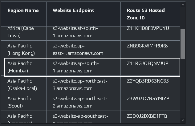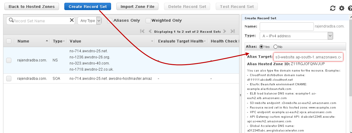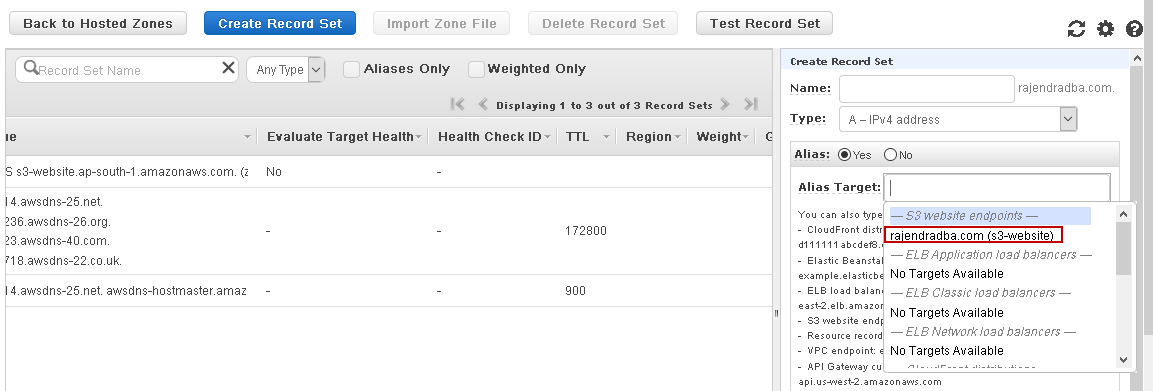 If you do not get the AWS S3 bucket name in the alias target, we can specify the Amazon S3 website endpoint for the region that consists of our S3 bucket for static website.