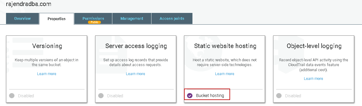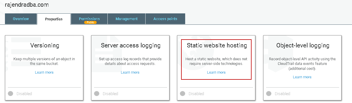 We need to configure the S3 bucket for hosting a static website. Open the bucket and navigate to properties. Here, you get bucket configurations such as versioning, server access logging and static website hosting.