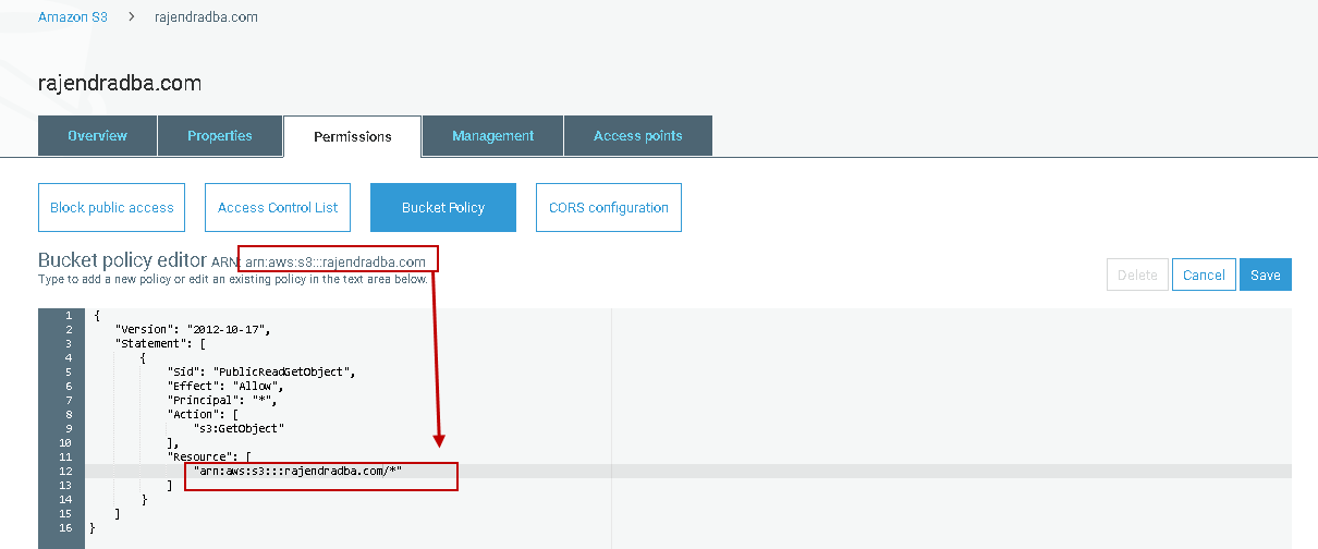 { "Version": "2012-10-17", "Statement": [ { "Sid": "PublicReadGetObject", "Effect": "Allow", "Principal": "*", "Action": [ "s3:GetObject" ], "Resource": [ "arn:aws:s3:::example.com/*" ] } ] } |