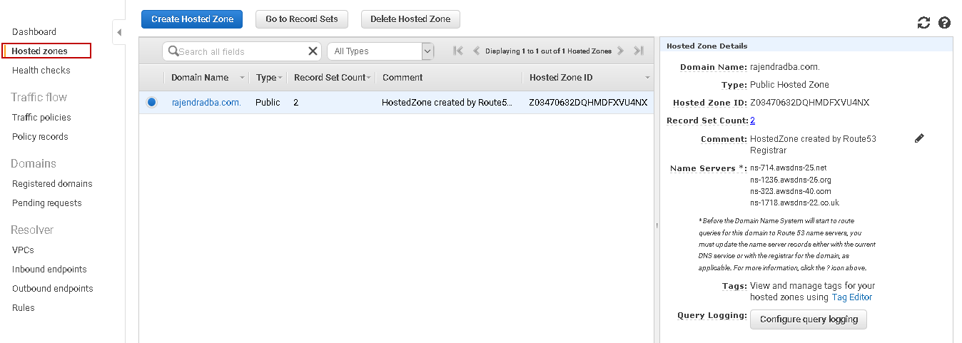 Click on the domain name, and it shows you pre-configured hosted zones. A hosted zone is like a container that has routing information for a domain. You can refer to Working with hosted zones for more details.
