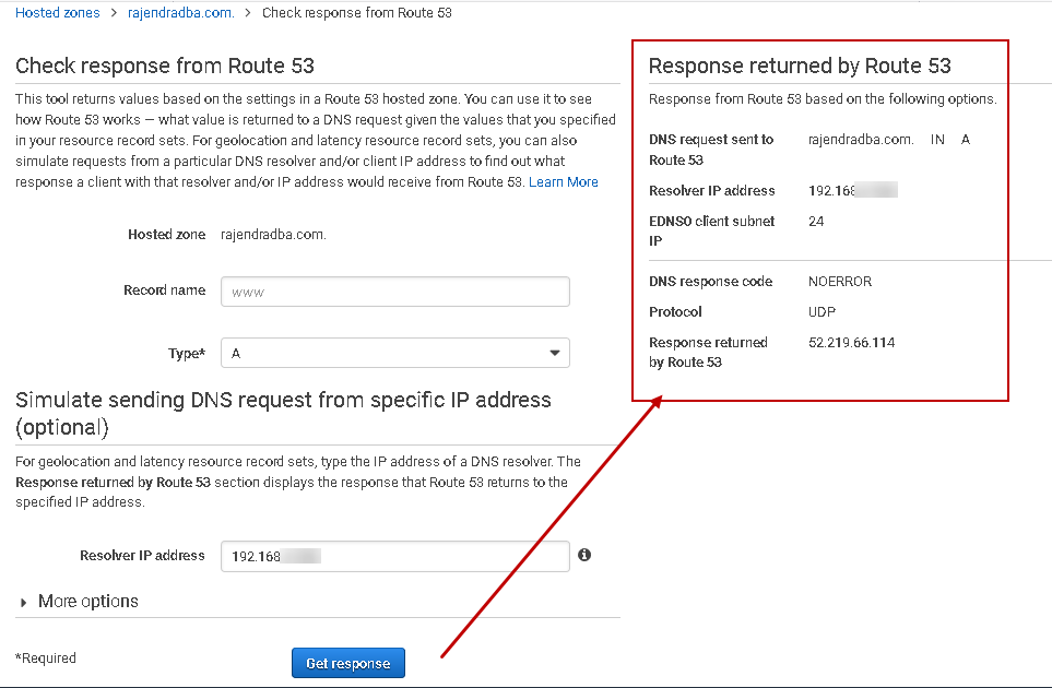 Specify your system IP and click on Get response. It checks the response from Route 53, and you get the following output. In case of any error, it shows you an error message.