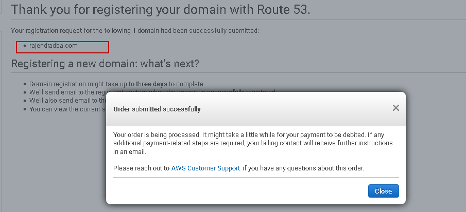 It takes some time to register your customized domain. You can view your domains in the registered domain section of Route53.