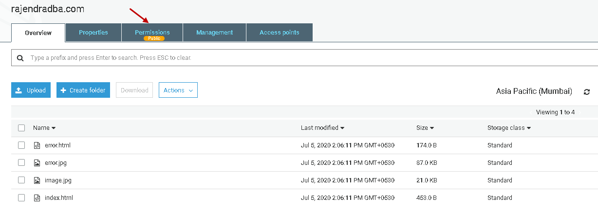 Now, open the bucket and go to Permissions -> Bucket Policy.