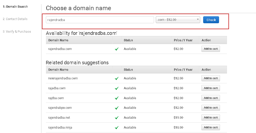 Click on the domain registration. Search for the domain name, and it shows you the price for different domains. Its price may vary in different domains. You can select the lowest price domain and click Next.