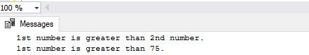 DECLARE @num1 INTEGER; DECLARE @num2 INTEGER; SET @num1 = 100; SET @num2 = 30; IF (@num1 > @num2) BEGIN PRINT '1st number is greater than 2nd number.' IF (@num1 > 75) PRINT '1st number is greater than 75.' ELSE IF (@num1 > 50) PRINT '1st number is greater than 50.' ELSE PRINT '1st number is less than or equal to 50.'; END ELSE IF (@num2 > @num1) PRINT '2nd number is greater than 1st number.' ELSE PRINT 'The numbers are equal.'; |