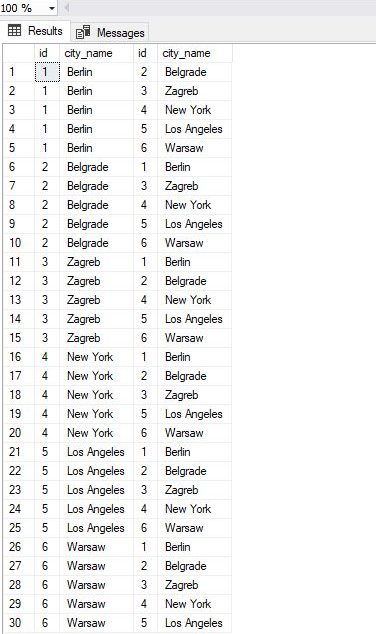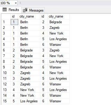 As expected, this result set has 15 rows. This is due to the fact doubled pairs were eliminated using the > sign (each city is in pair only with cities having id greater than his id, so we don’t “go back” and examine previously generated pairs with lower id values). You can notice that now we have a pair Berlin – Belgrade, but not a pair Belgrade – Berlin. We could have achieved the same using the < sign. In that case, the order of pairs would be different.