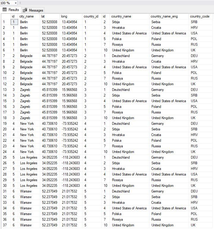 You can notice that we have 30 rows. We have 6 cities in our database. Since each city can be in a pair with 5 other cities (6 – that 1 city), that leads us to a total of 6 * 5 = 30 pairs. You can also notice that we have the same pair twice, with city names having switched positions in such pairs, e.g., Berlin – Belgrade & Belgrade – Berlin. For this example, that is OK, because we wanted exactly that.