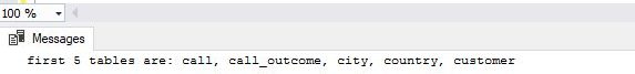 -- declare variables used in cursor DECLARE @table_name VARCHAR(128); DECLARE @table_names_5 VARCHAR(128); -- declare cursor DECLARE cursor_table_names CURSOR FOR SELECT TOP 5 TABLE_NAME FROM INFORMATION_SCHEMA.TABLES ORDER BY TABLE_NAME ASC; SET @table_names_5 = 'first 5 tables are: ' -- open cursor OPEN cursor_table_names; -- loop through a cursor FETCH NEXT FROM cursor_table_names INTO @table_name; WHILE @@FETCH_STATUS = 0 BEGIN IF @table_names_5 = 'first 5 tables are: ' SET @table_names_5 = CONCAT(@table_names_5, @table_name) ELSE SET @table_names_5 = CONCAT(@table_names_5, ', ', @table_name); FETCH NEXT FROM cursor_table_names INTO @table_name; END; PRINT @table_names_5; -- close and deallocate the cursor CLOSE cursor_table_names; DEALLOCATE cursor_table_names; |