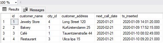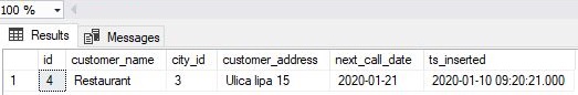 The result is, as expected, all details for the customer with id = 4. Please notice that we’ve listed parameter(s) without “(“ and “)” after the procedure name in the EXEC line.