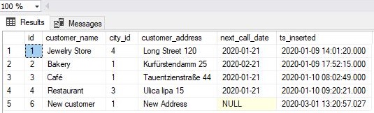 - For the value ts_inserted, we’ve used the SYSDATETIME() function to store the current time
