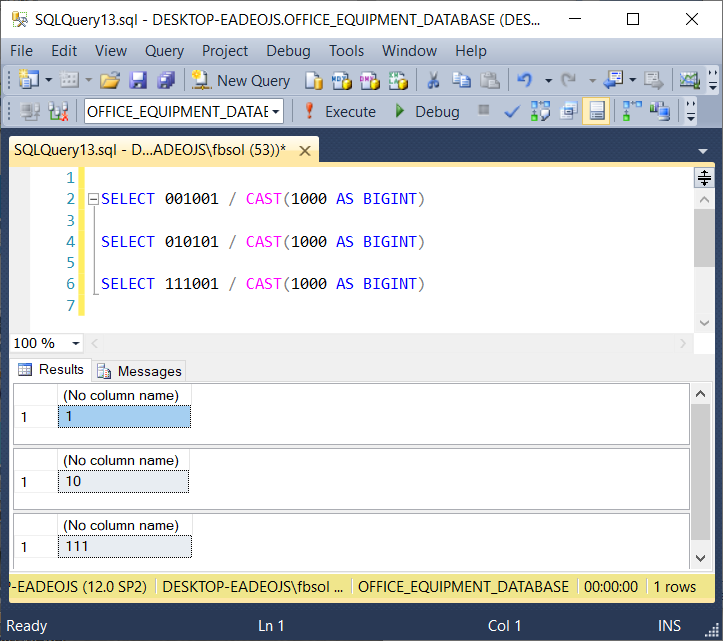 Lines 28 and 29 operate on the third column – OFFICE_EQUIPMENT_DESCRIPTION. Focusing on line 28, the third digit of @SORT_COLUMN_LIST from the left maps to column three, so we need to build the T-SQL code that extracts this digit from the parameter. The @SORT_COLUMN_LIST / CAST(1000 AS BIGINT)calculation first CASTs, or converts, 1000 to a bigint data type. The @SORT_COLUMN_LIST parameter has a bigint data type, and for “larger” values of this parameter, we need a divisor of the bigint data type to guarantee that the division operation will calculate correctly. It becomes a good practice to use the CAST function for all division operations in this stored procedure. The calculation divides @SORT_COLUMN_LIST by 1000, and throws away, or truncates, the remainder. If we divide a six-digit integer by 1000 in this way, we will remove the three digits on the right, as shown in this screenshot: