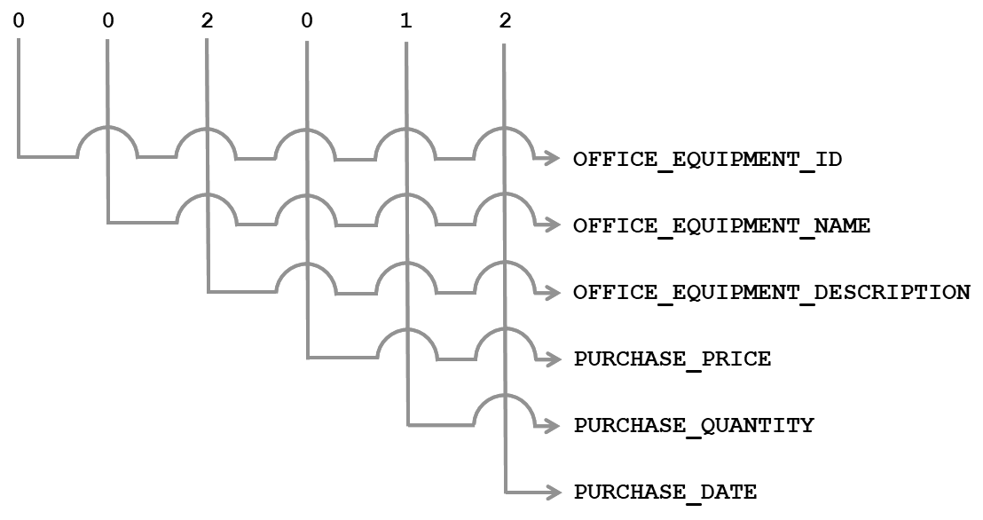The @SORT_COLUMN_LIST parameter declared at line 4 has a big integer, or bigint, data type. Microsoft explains that bigint data can have 19 digits. As we’ll see, the TSQL_SORTING stored procedure maps each digit in @SORT_COLUMN_LIST to one individual result set column. This means that the TSQL_SORTING engineering can cover as many as 19 columns in a result set. The examples shown in this article involve result sets with six columns, so the @SORT_COLUMN_LIST values in the examples have six digits. The TSQL_SORTING engineering also expects that each @SORT_COLUMN_LIST digit will have a value only in the 0, 1, or 2 range. The T-SQL engineering between lines 24 and 35 parses each parameter digit and maps each parsed parameter digit to a specific result set column. For example, this diagram shows how a parameter value of 002012 maps to the result set columns: