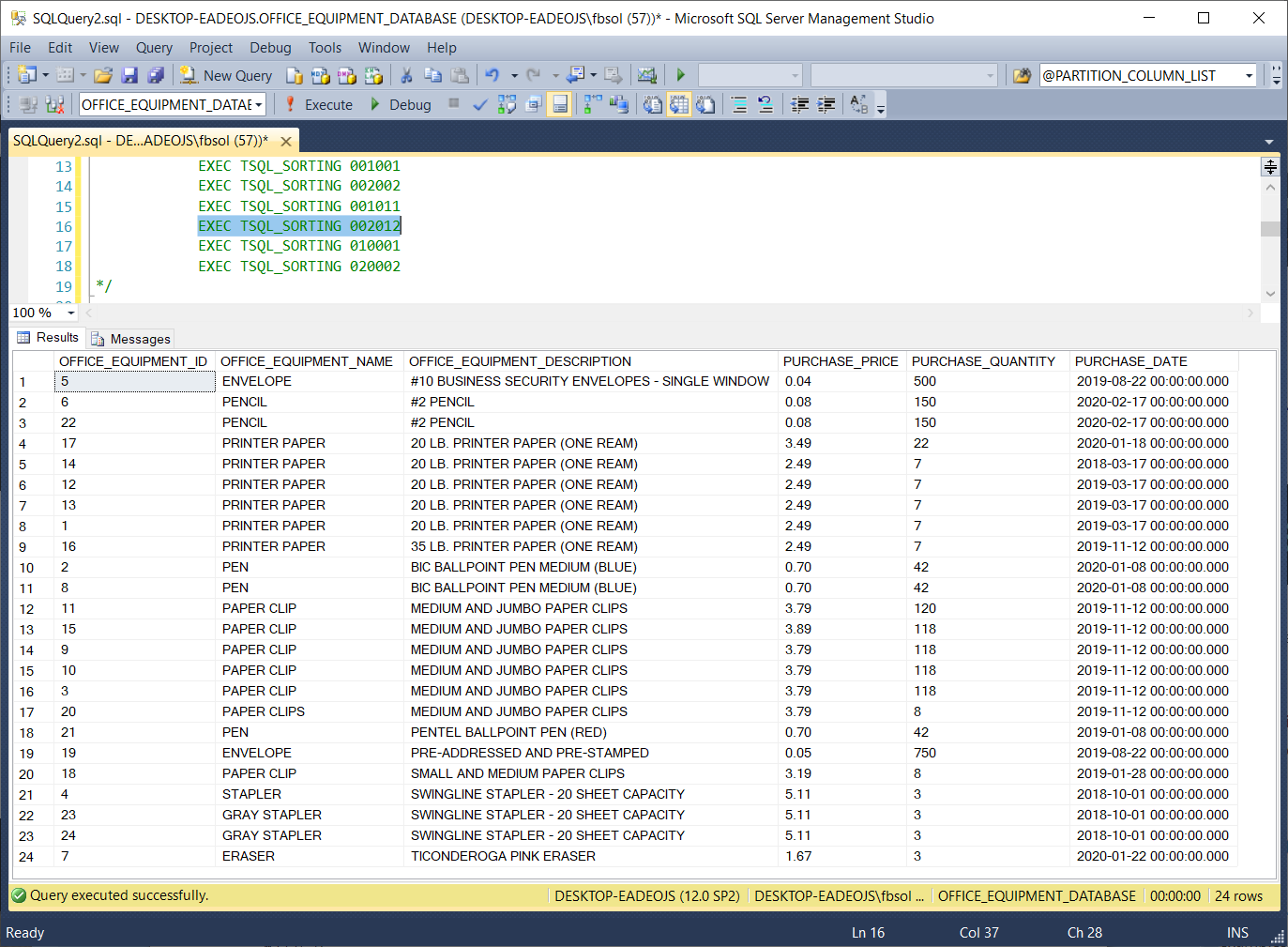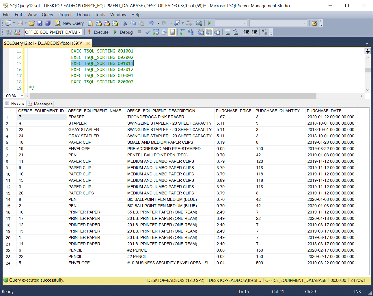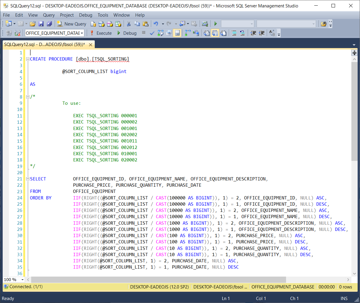The OFFICE_EQUIPMENT_DATABASE database has one stored procedure TSQL_SORTING with this code:
