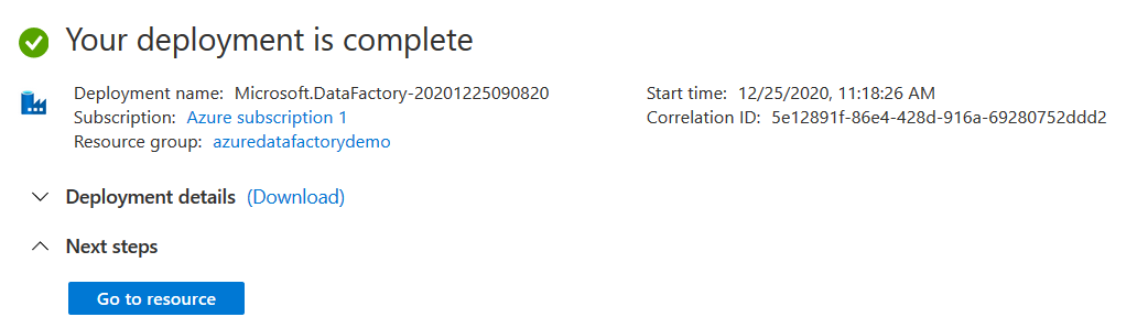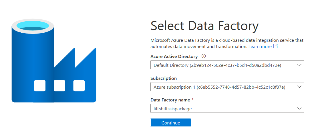 Initially, it asks you to choose the Azure active directory, subscription and data factory name. We can go with the default options on this page.