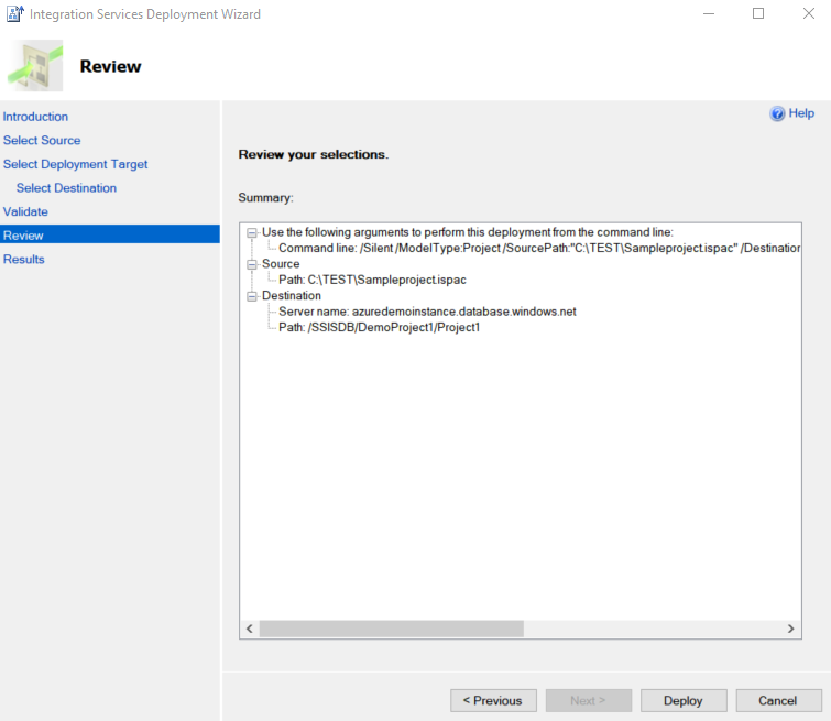 Review the Integration Service project deployment and click on Deploy. In summary, it gives a command line as well for the deployment.