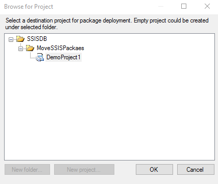 In the SSISDB catalog folder, create a new project [DemoProject1], as shown below.