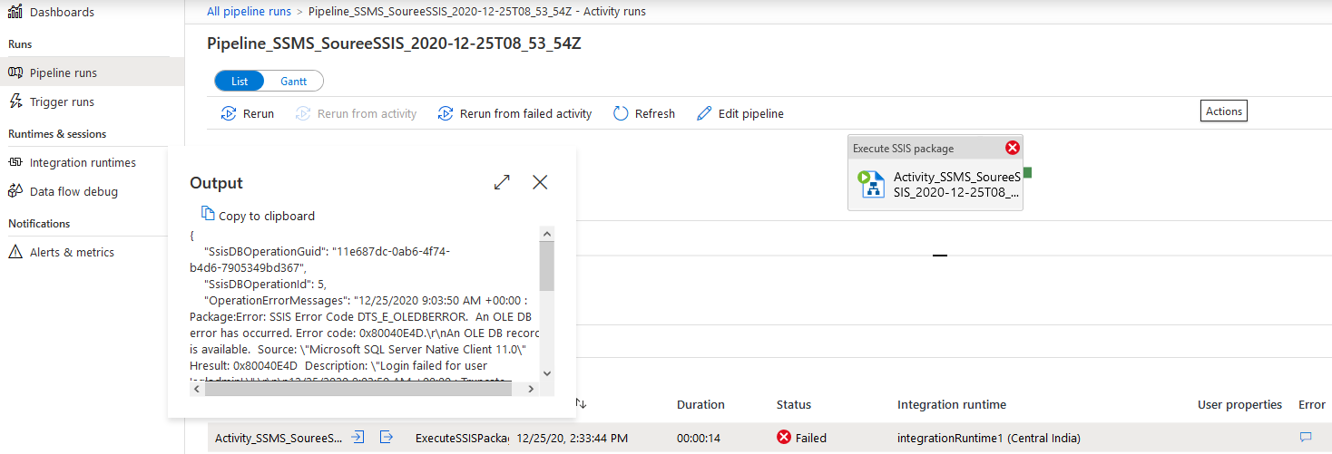 In the activity runs, you can see icons for input and outputs in the activity name columns. Click on Output, and it gives you an error message. As shown below, the package failed due to login failure.