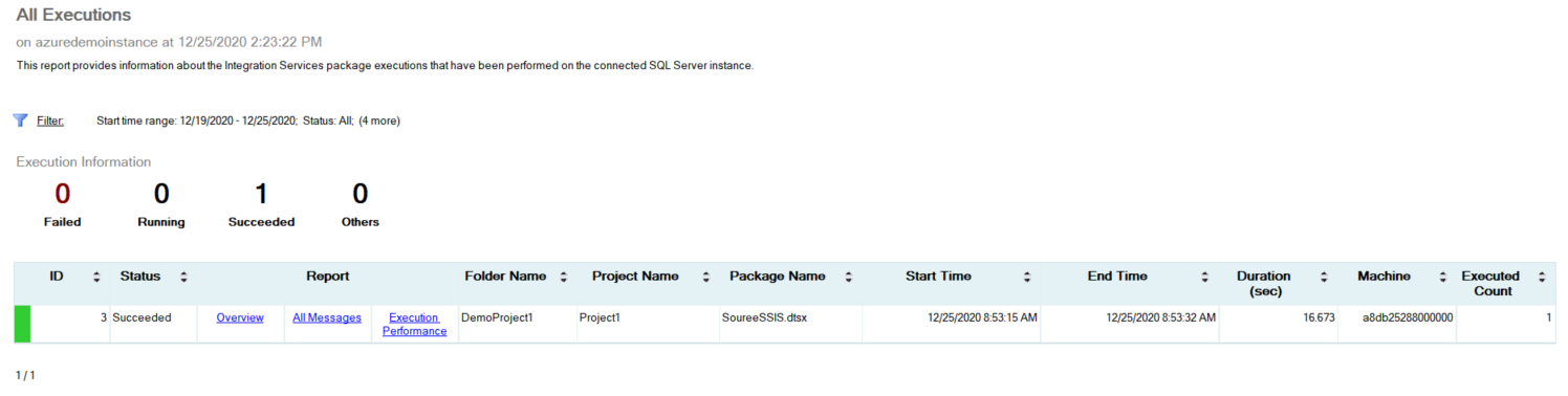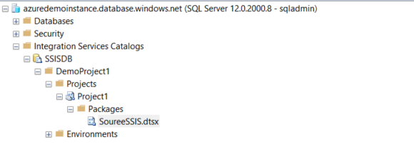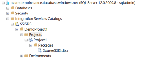 As shown below, we can see the SourceSSIS.dtsx package in the Project1 folder of the SSISDB catalog.