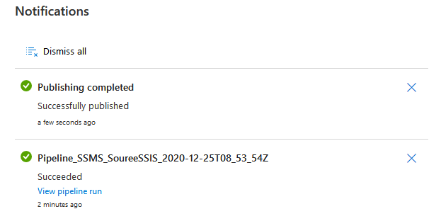 In the notification window, you get messages for publishing status, pipeline execution etc.