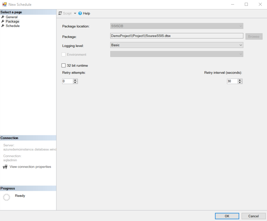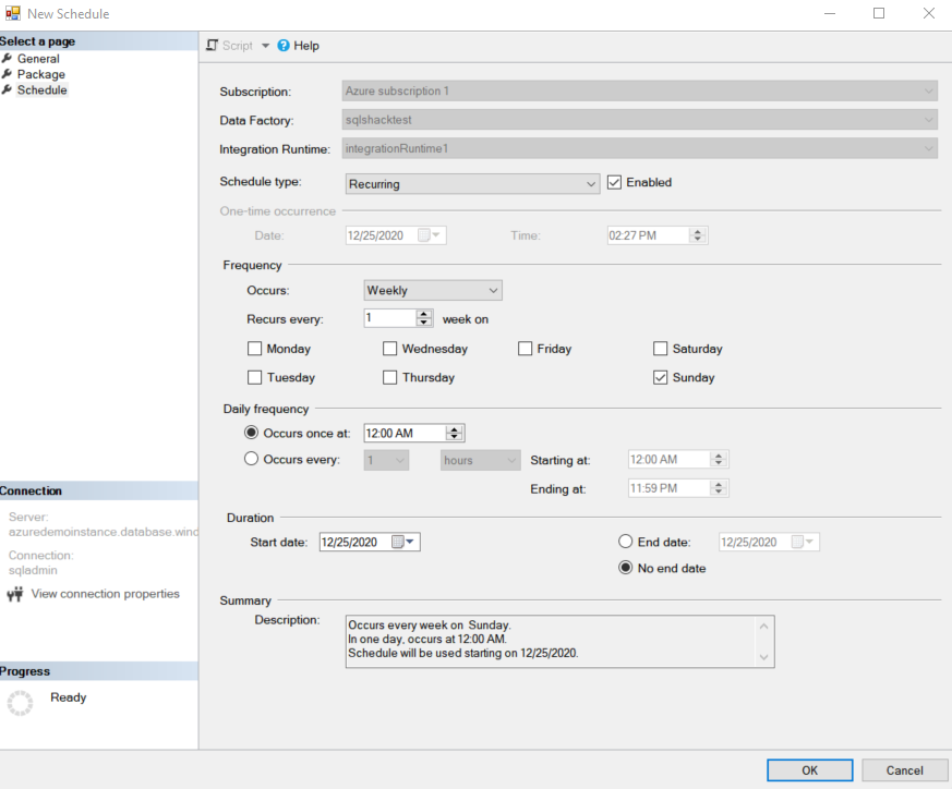 Schedule: Package execution schedule similar to an SQL Server agent job. By default, it set job execution frequency as Weekly, on every Sunday at midnight. You can modify the schedule