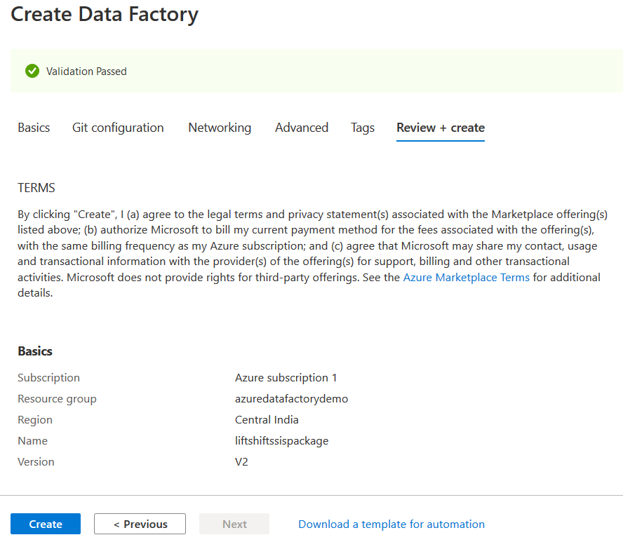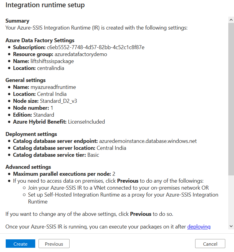 On the next page, review your Azure-SSIS Integration runtime configuration and click on Create.