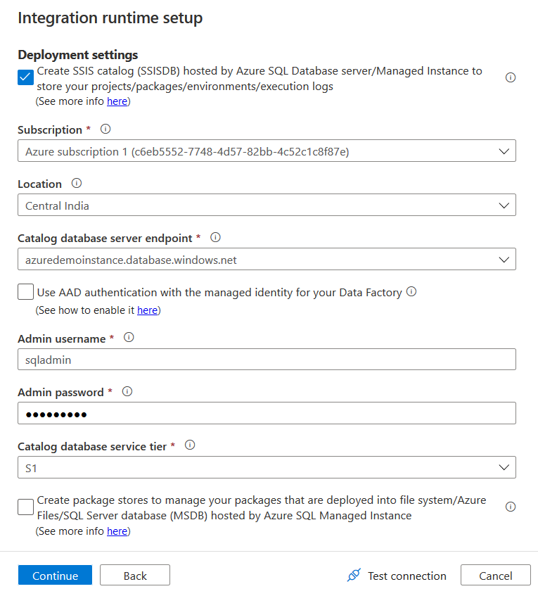 Click on Continue. On the next page, select your Azure SQL Database endpoint. The IR runtime creates an SSISDB catalog for your Azure SQL Database.