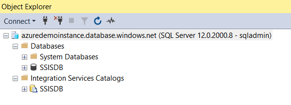 It connects to your Azure SQL Database, and you see an SSISDB database and integration Services Catalogs.