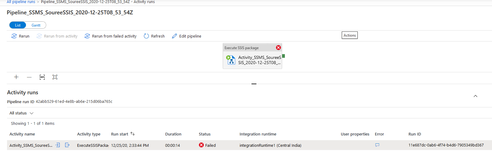 You can view the package failures from the ADF pipeline. For example, I modified the Azure SQL Database credentials, so that package execution fails. As shown below, the status of the package is failed.