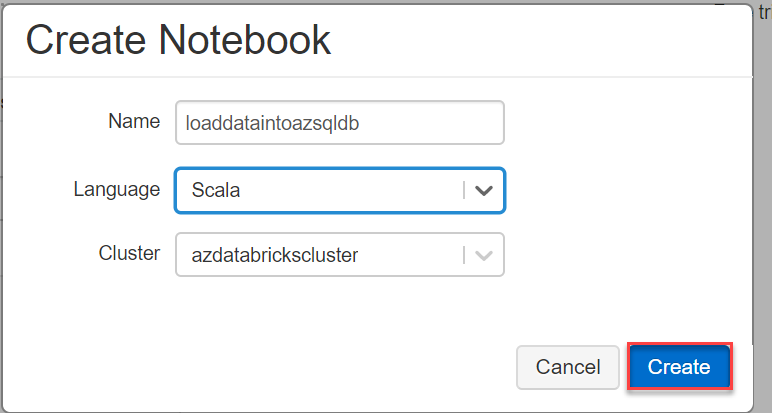 Type in a Name for the notebook and select Scala as the language. The Cluster name is self-populated as there was just one cluster created, in case you have more clusters, you can always select from the drop-down list of your clusters. Finally, click Create to create a Scala notebook.