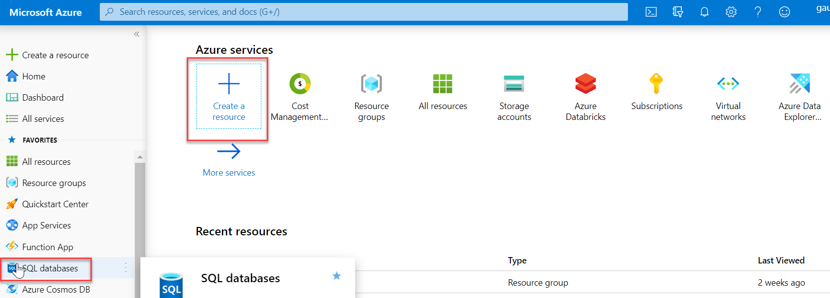 On the Azure portal, you can either directly click on Create a resource button or SQL databases on the left vertical menu bar to land on the Create SQL Database screen.