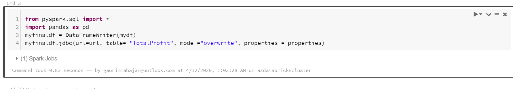 On the Azure Databricks portal, execute the below code. This will load the CSV file into a table named SalesTotalProfit in the SQL Database on Azure.