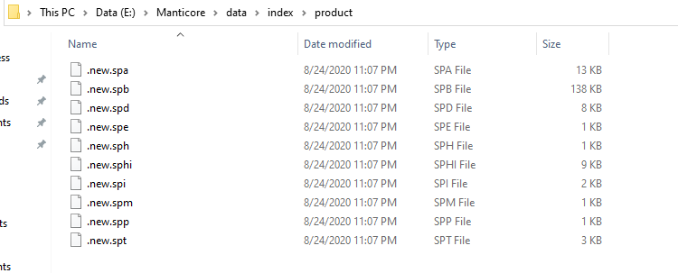 If we take a look within the index directory (E:\Manticore\data\index\product), we will find that several files are created.