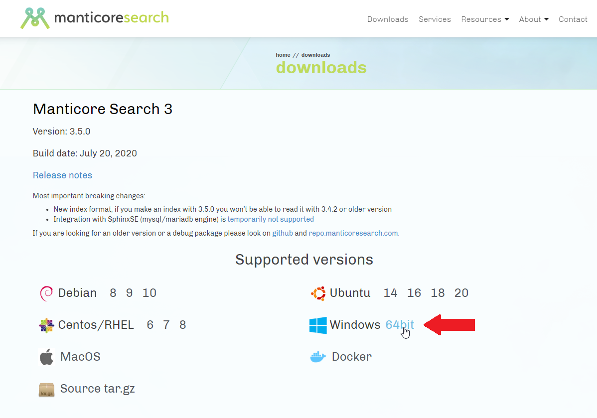 To download the latest release of Manticore, you should open the Manticore home page, go to the downloads page, beside the Windows icon, click on the 64-bit hyperlink.