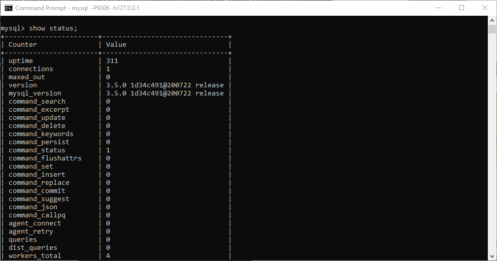 Now, let’s execute the “show status” command view the server (Manticore engine) status. The result is as follows: