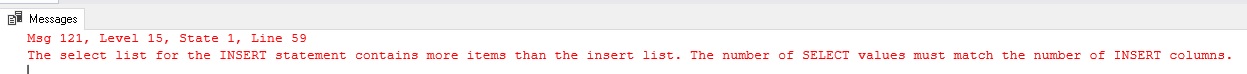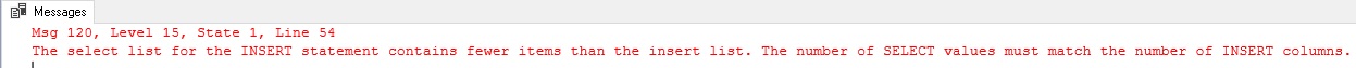 The upside (if we wish to call it an upside) of this approach is that it is fast and requires less upkeep as there’s no need to write and maintain a list of columns with the insert. The downside is that if you mismatch columns, you may get a different sort of error message. Consider the following query: