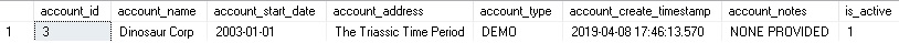INSERT INTO dbo.account (account_name, account_start_date, account_address, account_type, account_create_timestamp, is_active) SELECT 'Dinosaur Corp', '1/1/2003', 'The Triassic Time Period', 'DEMO', GETUTCDATE(), 1; |