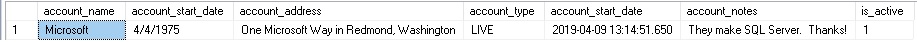 INSERT INTO dbo.account (account_name, account_start_date, account_address, account_type, account_create_timestamp, account_notes, is_active) SELECT 'Microsoft' AS account_name, '4/4/1975' AS account_start_date, 'One Microsoft Way in Redmond, Washington' AS account_address, 'LIVE' AS account_type, GETUTCDATE() AS account_start_date, 'They make SQL Server. Thanks!' AS account_notes, 1 AS is_active; |