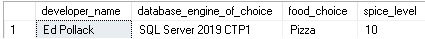SELECT 'Ed Pollack' AS developer_name, 'SQL Server 2019 CTP1' AS database_engine_of_choice, 'Pizza' AS food_choice, 10 AS spice_level INTO #developer_info; |