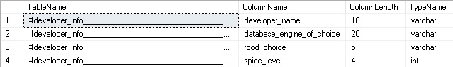 SELECT tables.name AS TableName, columns.name AS ColumnName, columns.max_length AS ColumnLength, types.name AS TypeName FROM TempDB.sys.tables INNER JOIN TempDB.sys.columns ON tables.object_id = columns.object_id INNER JOIN TempDB.sys.types ON types.user_type_id = columns.user_type_id WHERE tables.name LIKE '#developer_info%'; |