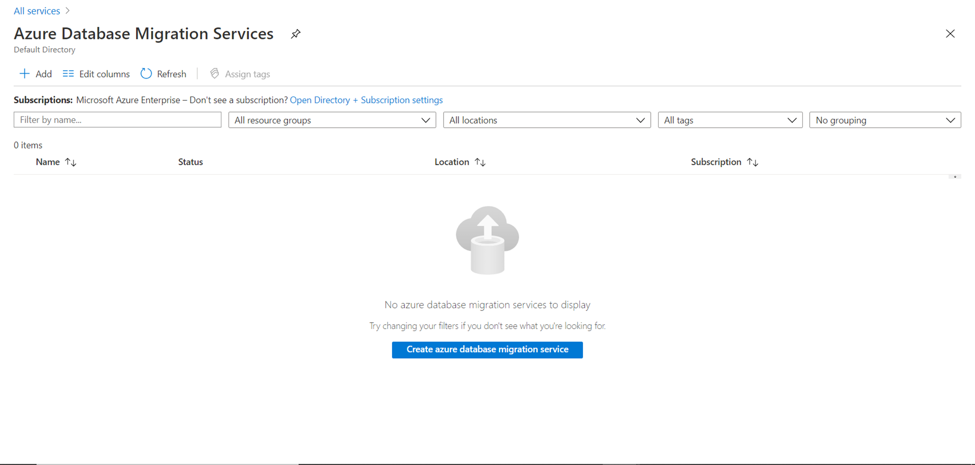 Navigate to the Database Migration Service on Azure to reach the dashboard page as shown below. This is the point where we can create a new instance.