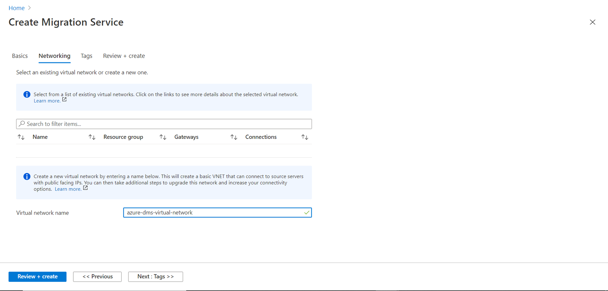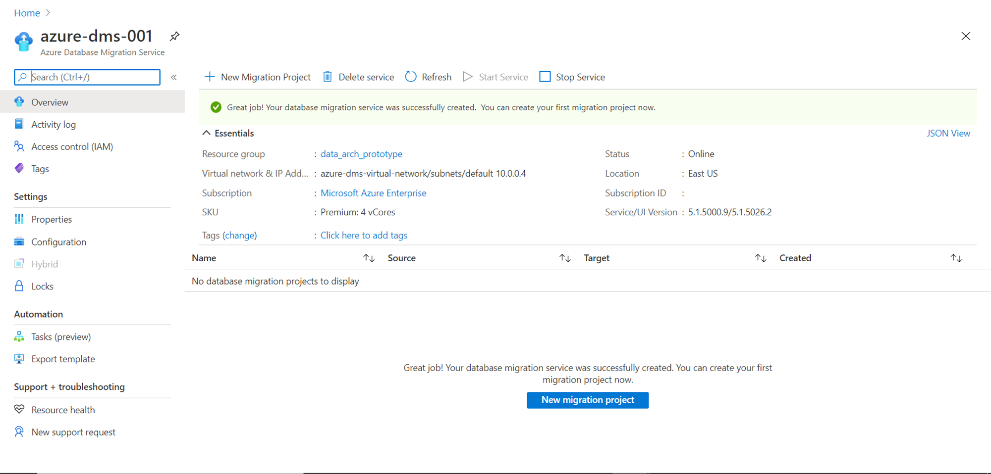 Tags is an optional step, so if we desire to add tags, click on the Tags button. If not, we can directly click on the Review + create button to deploy an instance of the database migration service. Once the instance is ready, it will look as shown below on the dashboard page.
