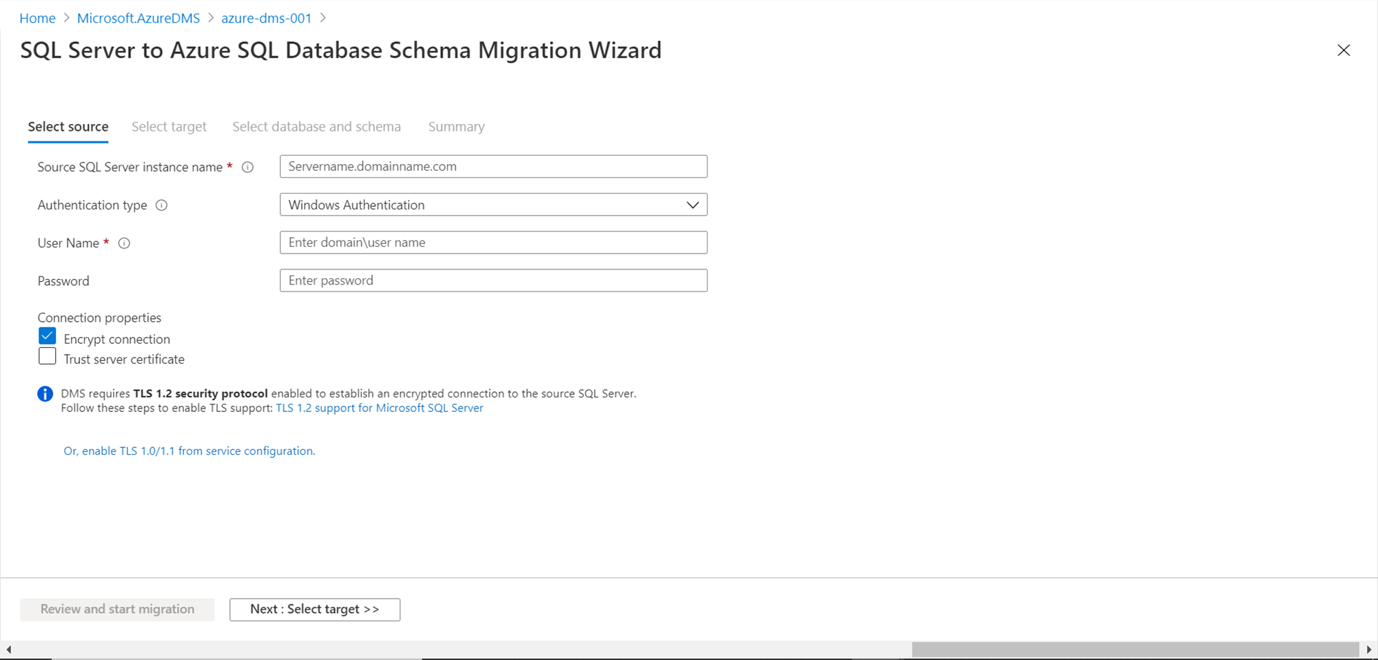 Finally, once the activity is defined, we would reach the last part of the configuration where we need to provide the connection credentials and mapping information. Show below is the configuration wizard for a schema migration activity, where we need to provide source credentials, target credentials, desired schema from the respective database and then start the activity, which would effectively migrate the schema to Azure SQL Database.