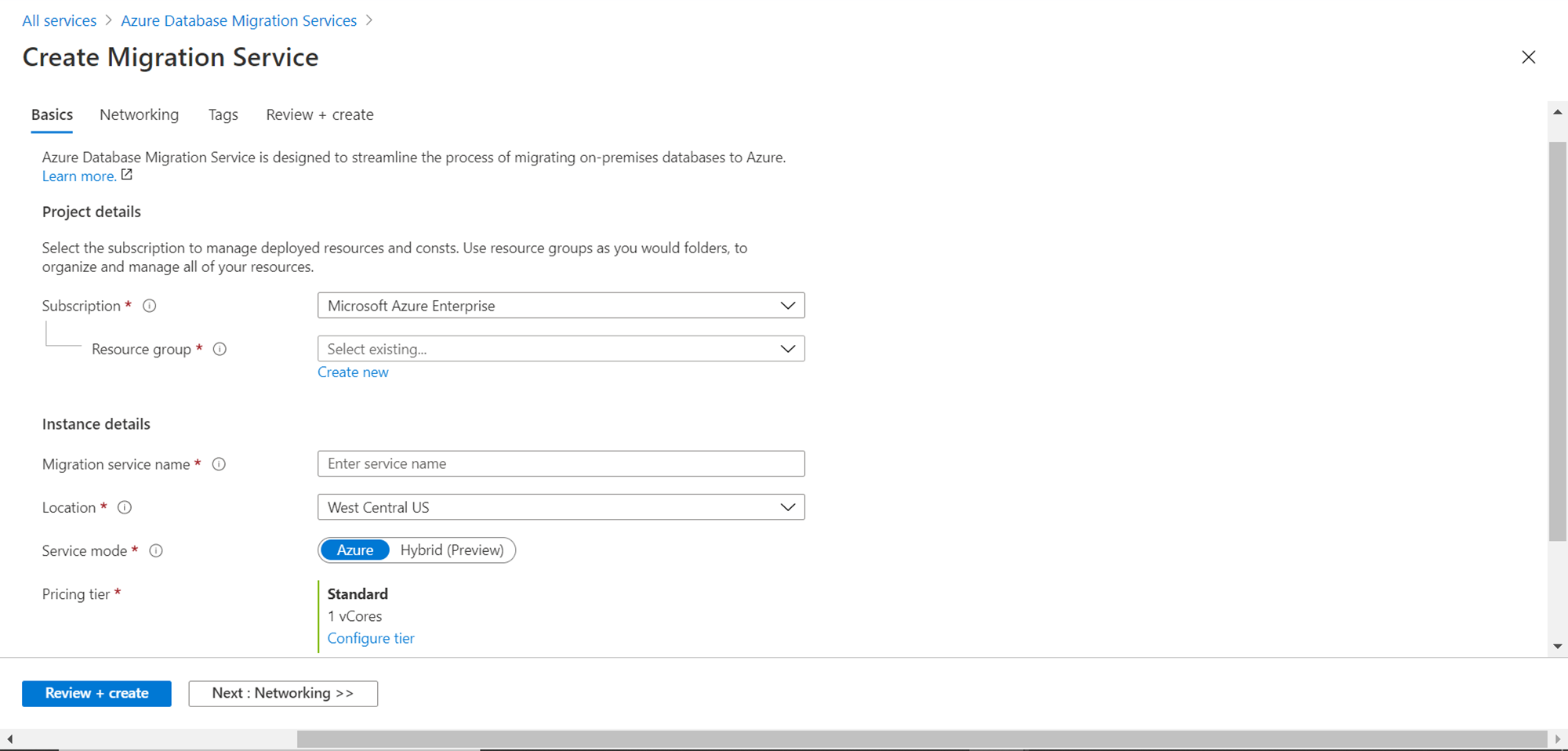 Click on the Create azure database migration service, which will pop-up a new screen as shown below. We need to fill up the basic details. One key setting is the service mode – which can be Hybrid or Azure-based. The default value is Azure. Hybrid mode allows you to use an on-premises machine to carry out the migration, while the Azure option uses Azure-based resources.