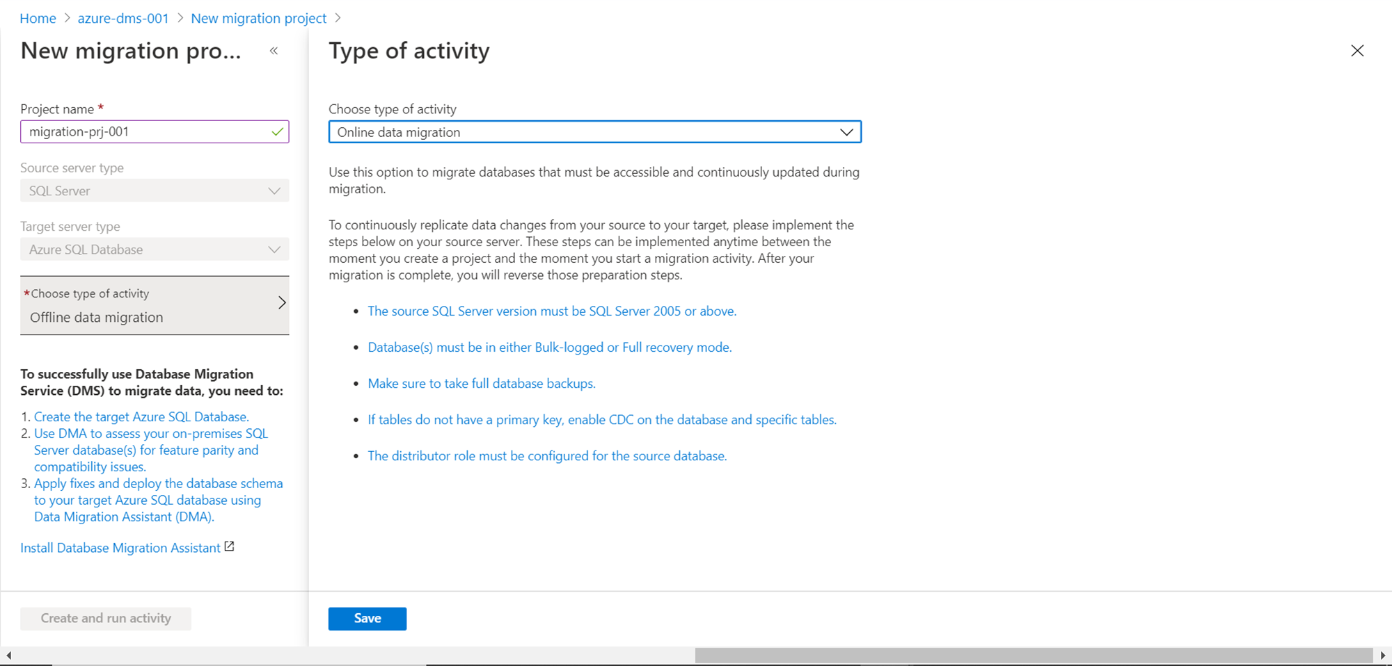 After selecting the source and target databases, we need to select the type of migration activity we intend to perform. In this case, the supported activities are schema-only migration, offline data migration, online data migration, and an option to just create a migration project for now without defining the type of migration activity. Once done we can click on the Save button to save the configuration.